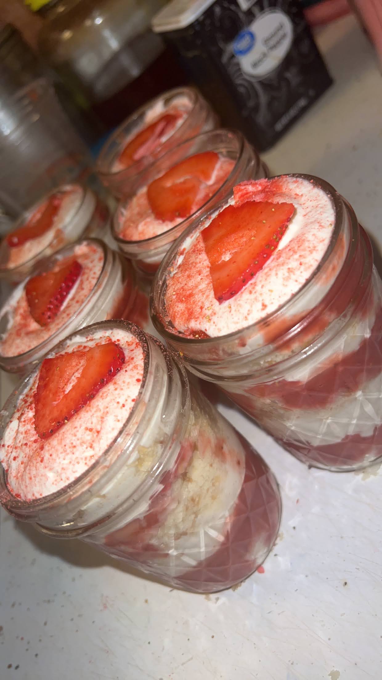 Vanilla cake, sliced strawberries, whipped cream icing layered